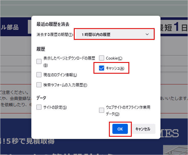 3.期間を選択し、[キャッシュ]にチェックを入れ、[OK]をクリックします。