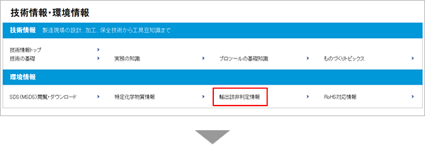 トップページの「技術情報・環境情報」の中の環境情報「輸出該非判定情報」をクリック