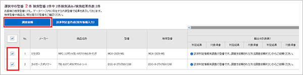 調査依頼を希望する型番にチェックを入れ、「調査依頼」をクリック