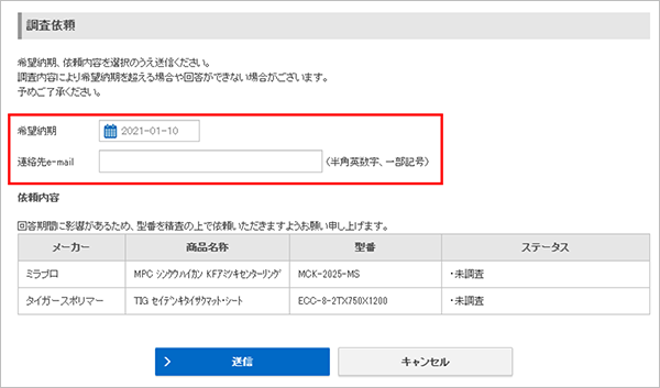 希望納期を選択、連絡先e-mailを入力し、依頼内容に間違いがないことをご確認の上「送信」をクリック