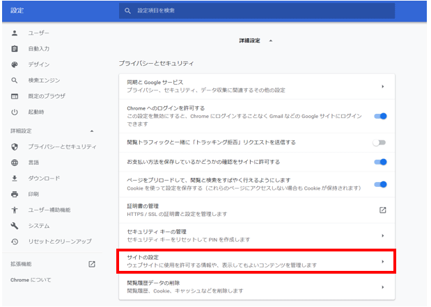 3. [プライバシーとセキュリティ] セクションで [サイトの設定] をクリックします。