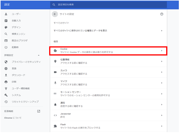 4.[Cookie]をクリックします。