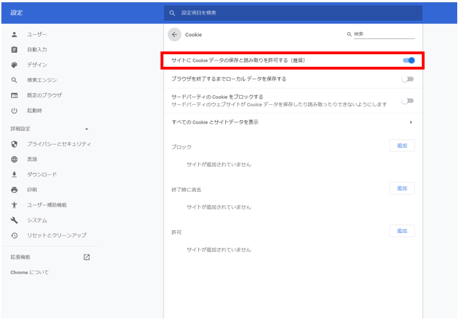 5.[サイトにCookieデータの保存と読み取りを許可する(推奨)]をONにする。