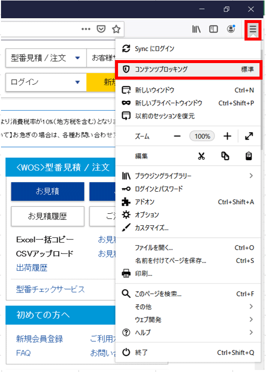 1. Firefoxを起動し、画面右上にあるFirefoxメニューをクリックし、[コンテンツブロッキング]をクリックします。