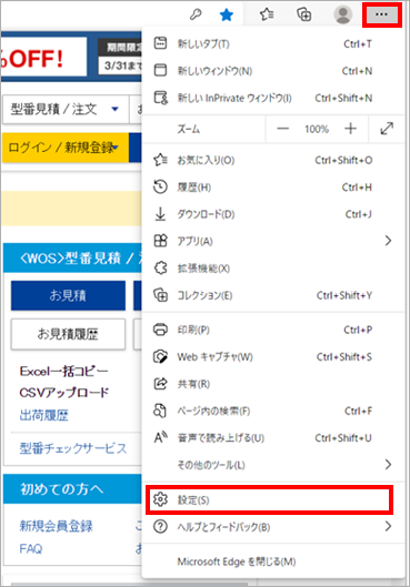 1. Microsoft Edgeを起動し、画面右上にあるメニューをクリックし、[設定]をクリックします。