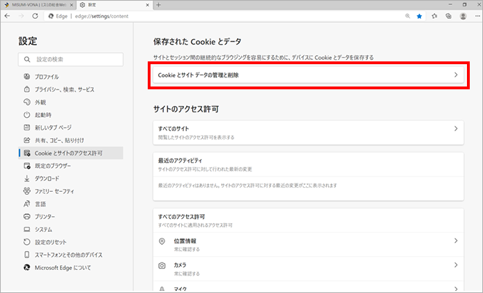2.設定画面左側メニューの[Cookieとサイトのアクセス許可]をクリックします。