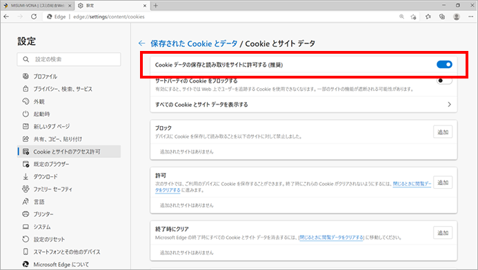 4.[Cookieデータの保存と読み取りをサイトに許可する(推奨)]のトグルをクリックしオン(右側の状態)にします。