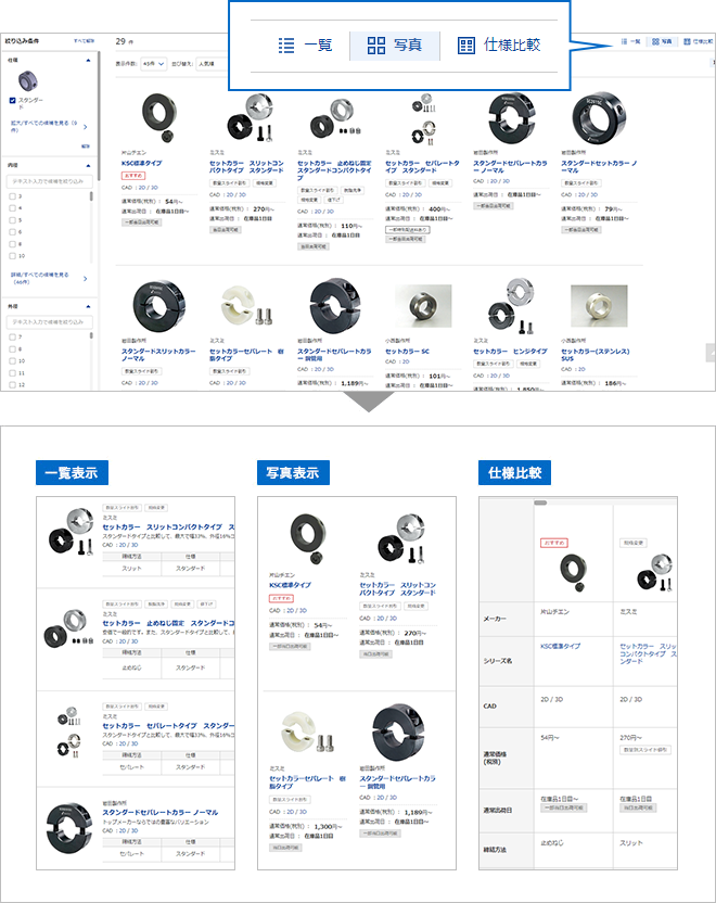 商品リストの「一覧」「写真」「仕様比較」項目をクリックすると、商品の表示形式を切り替えることができます。