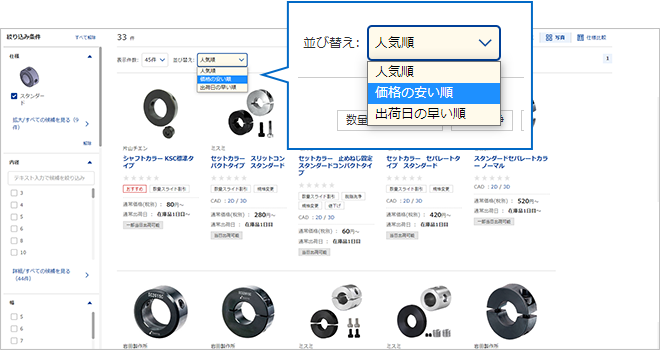 商品リストの「並び替え」プルダウンから「人気順」「価格の安い順」「出荷日の早い順」を選んで、商品を並び替えることができます。