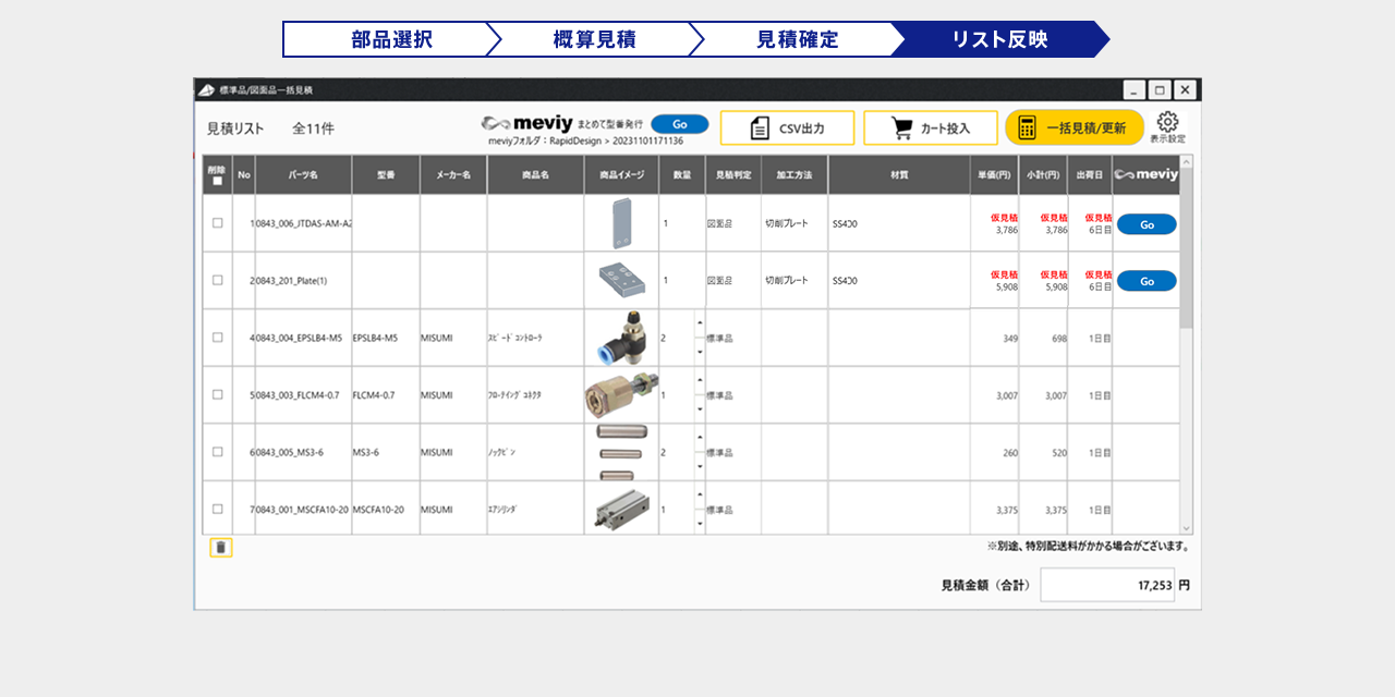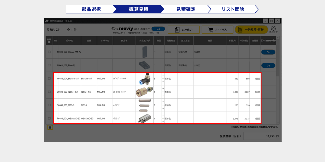 見積リストをCSVファイルで出力と、ミスミサイトの注文画面にカート投入も可能