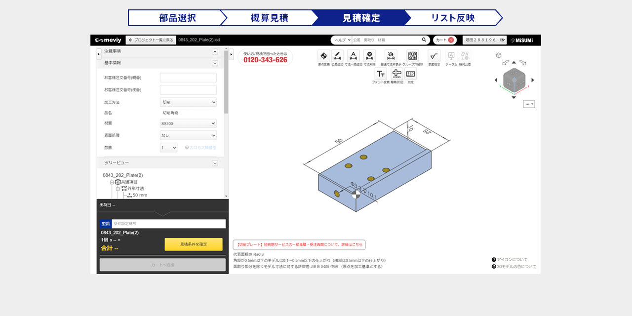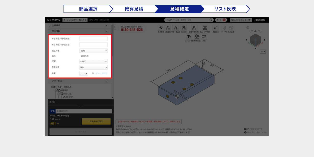 meviyのページへ遷移し、仕様を選択して見積条件を確定ボタンをクリック