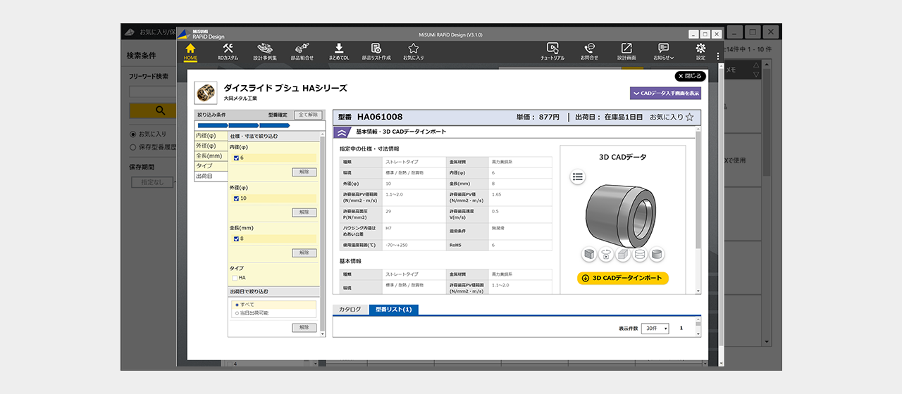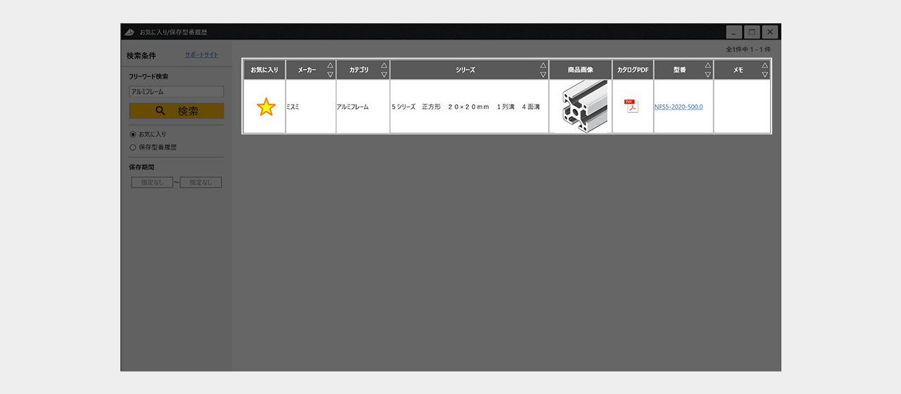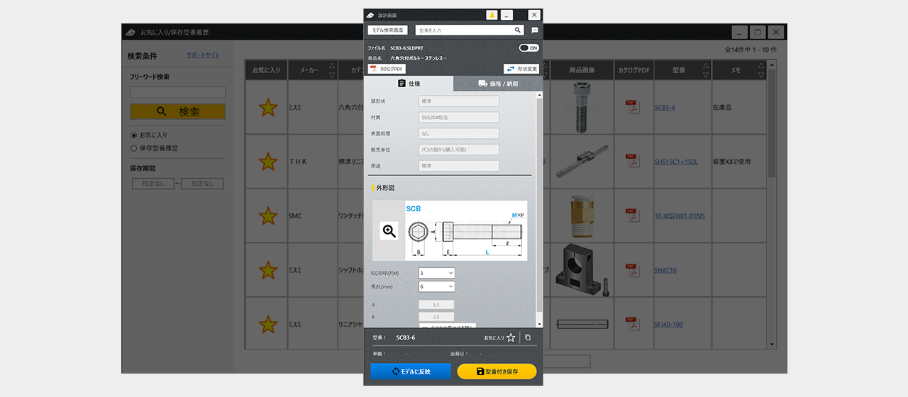 お気に入りと保存型番履歴から CADモデルをインポート可能です