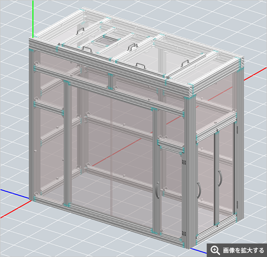 • 既存の装置カバーがアクリル板を立方体形状に並べたシンプル形状のものだったため、新規にアルミフレームでカバーを作成