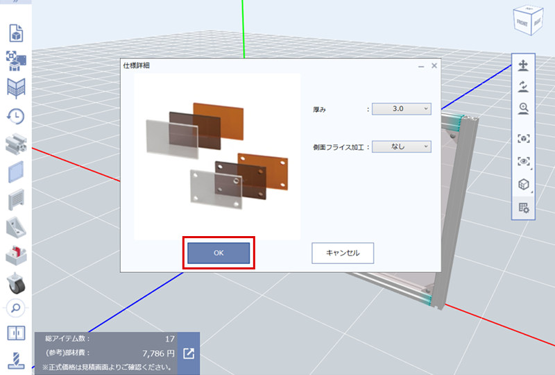 (6)仕様詳細(パネルの厚み、側面加工)を確認して「OK」