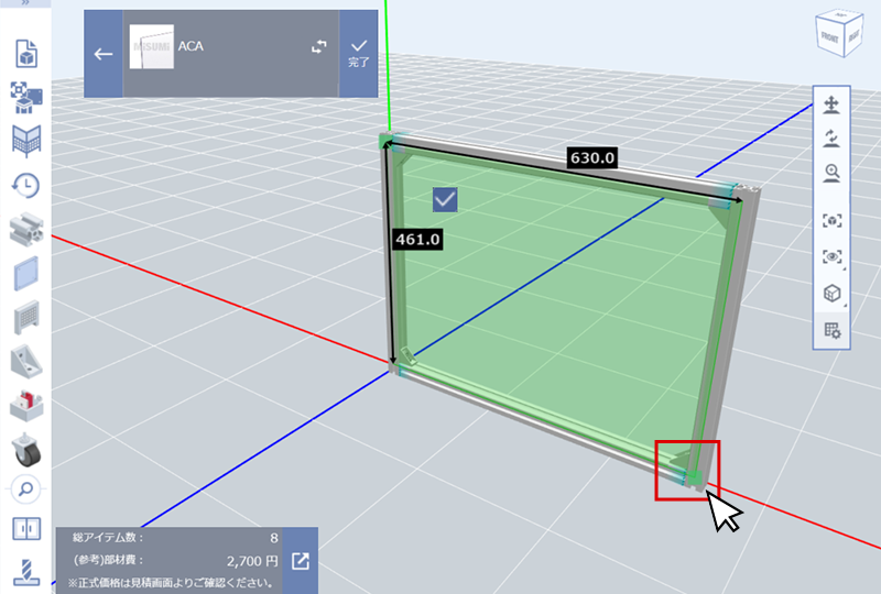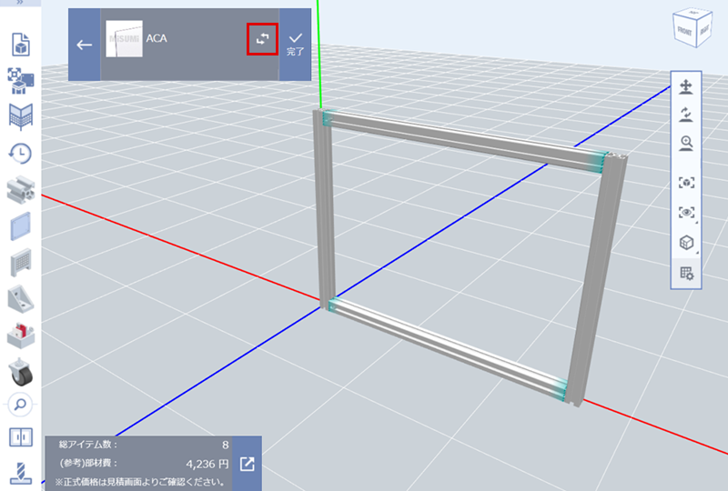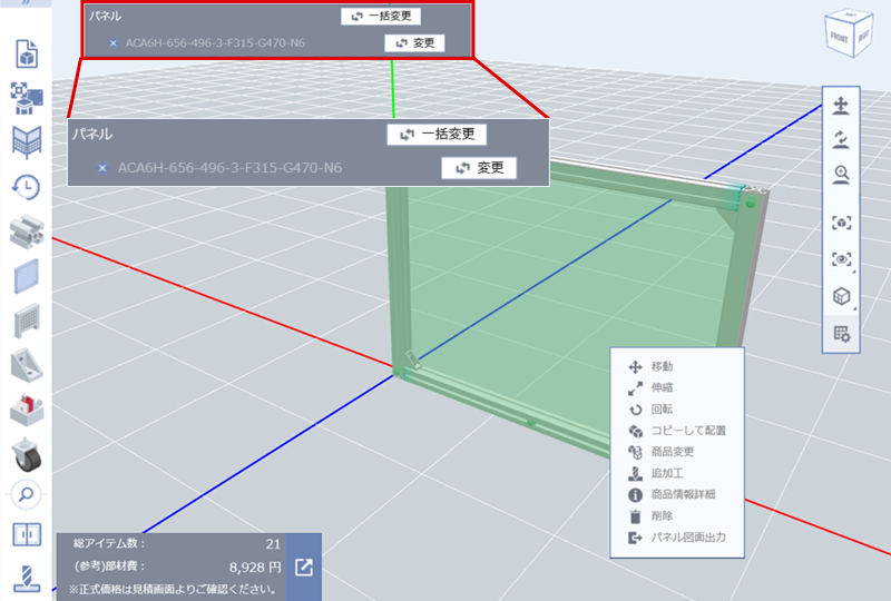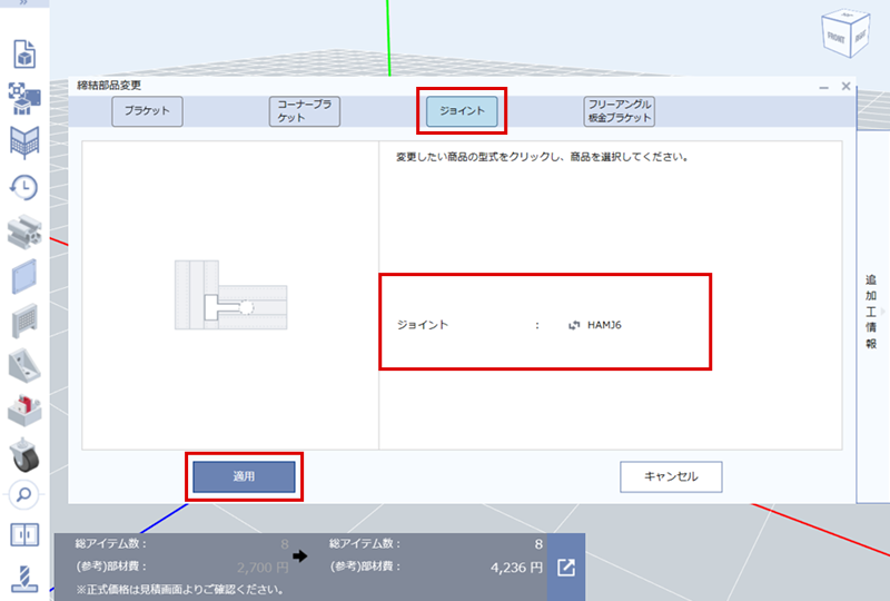 (2)挿入するアルミフレームの枠すべてを選択し、アルミフレームの締結部品を変更する